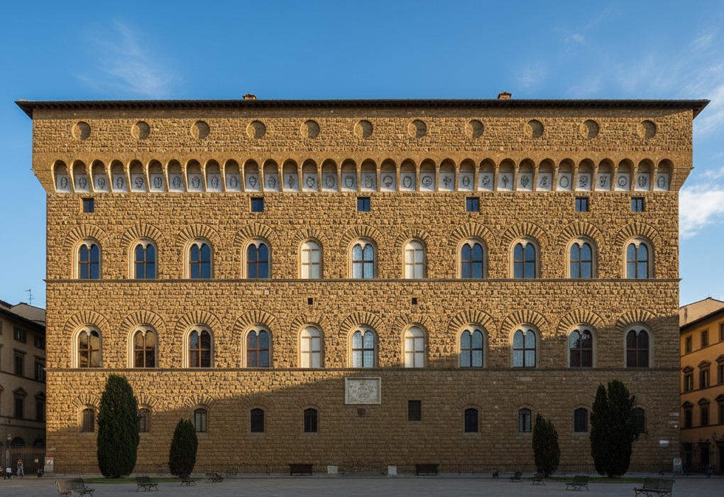 Giorgio Vasari — mais conhecido hoje como autor de “As Vidas dos Artistas” — projetou os Uffizi como uma demonstração de poder urbano. O edifício conecta a Piazza della Signoria ao rio Arno em linha reta monumental, enquadrando o Palazzo Vecchio como pano de fundo num golpe arquitetônico calculado. A construção levou décadas e foi continuada por Bernardo Buontalenti após a morte de Vasari, em 1574.